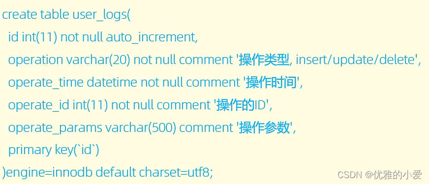 通过触发器记录tb_user表的数据变更日子,将变更日志插入到日志表user_logs中,包含增加、修改、删除;