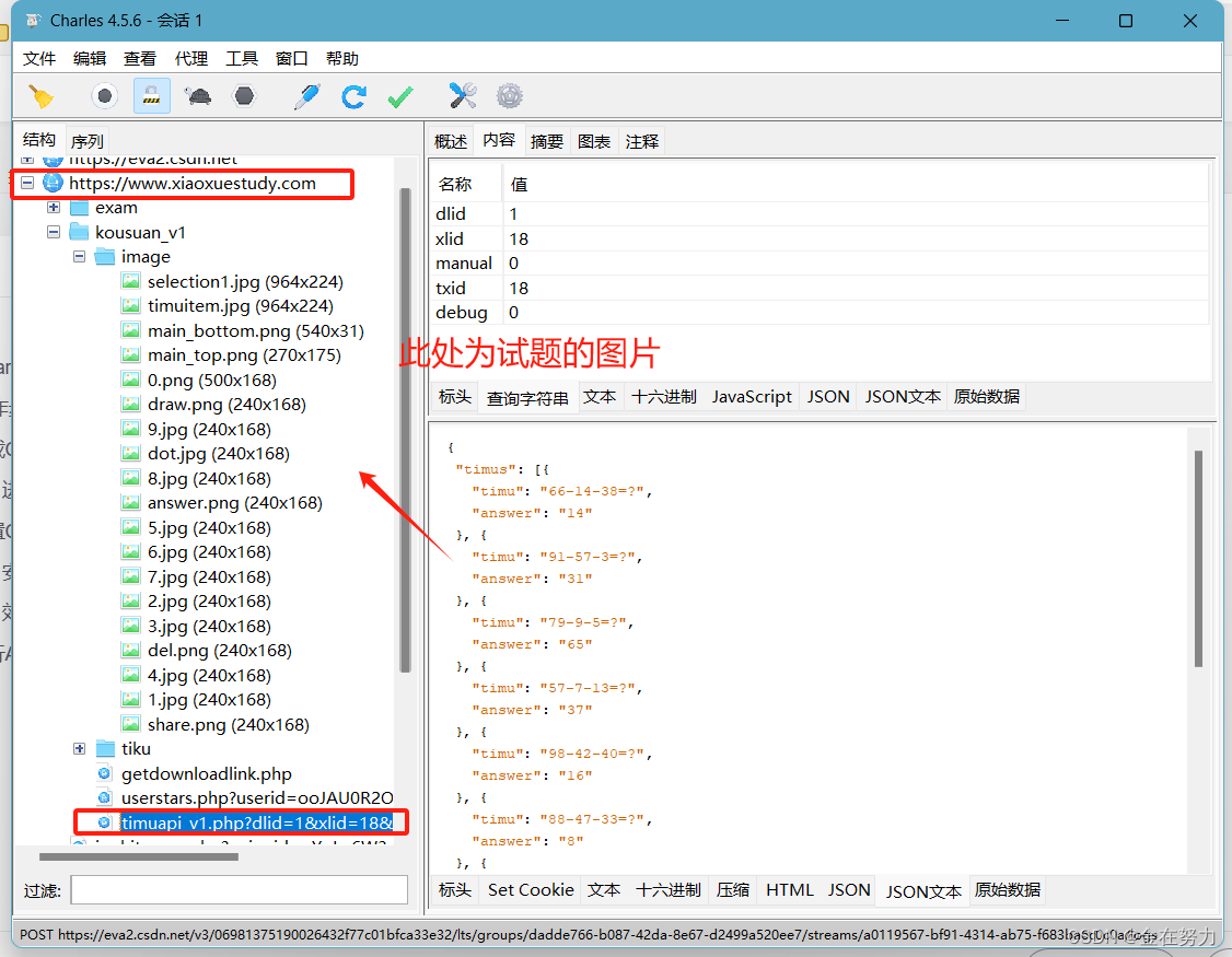 注意: Charles需要一直开启,同时在微信中打开你想要获取的题库,即可抓取到想要的“题库”了。