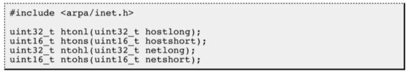 为使网络程序具有可移植性,使同样的C代码在大端和小端计算机上编译后都能正常运行,可以调用以下库函数,做网络字节序和主机字节序的转换。
