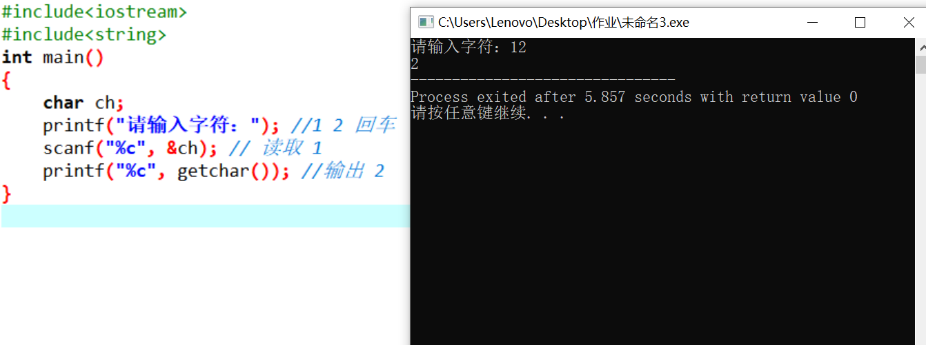 在调用getchar()函数时,编译器会依次读取用户键入缓存区的一个字符(注意这里只读取一个字符,如果缓存区有多个字符,那么将会读取上一次被读取字符的下一个字符),如果缓存区没有用户键入的字符,那么编译器会等待用户键入并回车后再执行下一步 (注意键入后的回车键也算一个字符)。