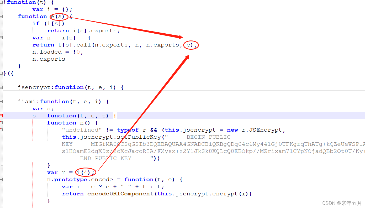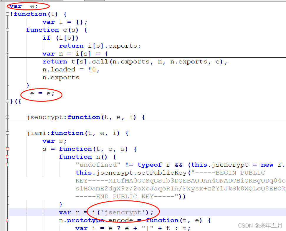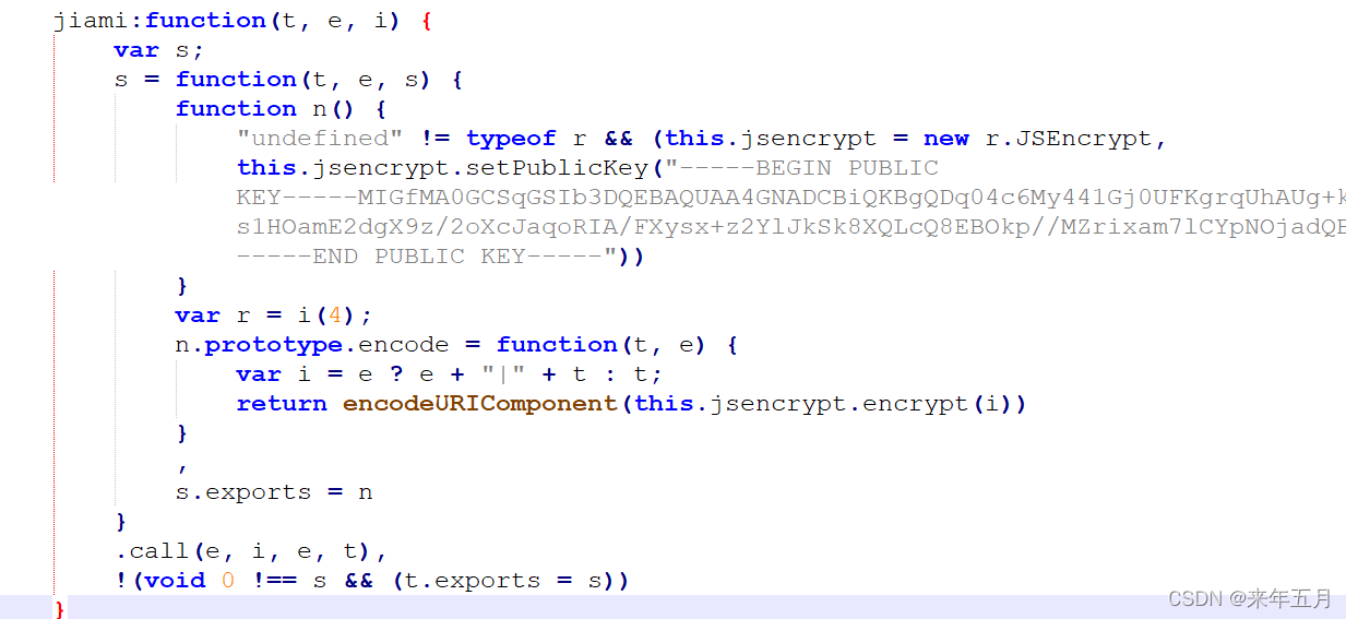 知道这层含义,我们只需要稍微改写一下就能生成我们想要的的,定义一个全局变量_e,将i原本调用的4换成我们自己定义的名字:jsencrypt,在自己写一个调用的办法就可以了。