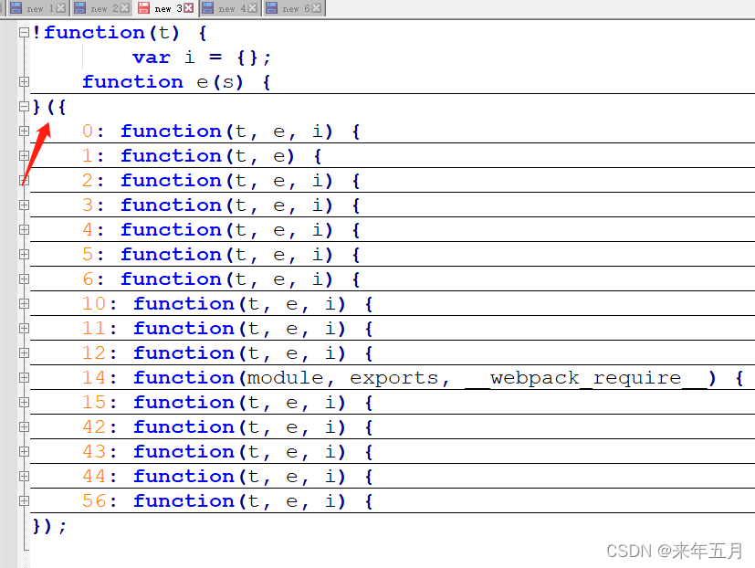 这时把所有代码折叠起来,发现了webpack关键字样, 凡是最后图中这个标记的类型毫无疑问是webpack类型的。有时也是 }([ 这种列表形式