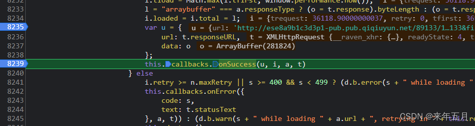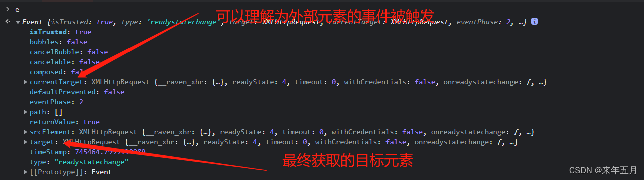 断点断住以后再次分析一下e。图下已经做了标记,现在我们这边需要需要的就是cuurrentTargct元素的responseText属性。