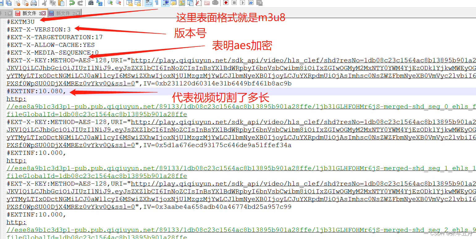 这边先将文件保存本地进行分析一下,是将每一个切片进行了加密。每一段都看到一个iv都携带了一个视频的链接。