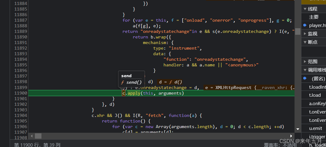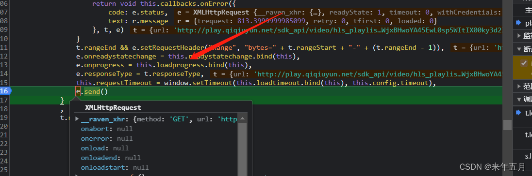 跟栈到到位置断住,e就是XMLHttpRequest,现在要寻找XMLHttpRequest状态发生改变的参数,也就是onreadystatechange函数,这里直接搜索即可,发现被绑定到readystatechange上了,直接跟过去,下断即可。