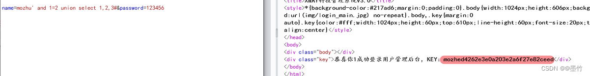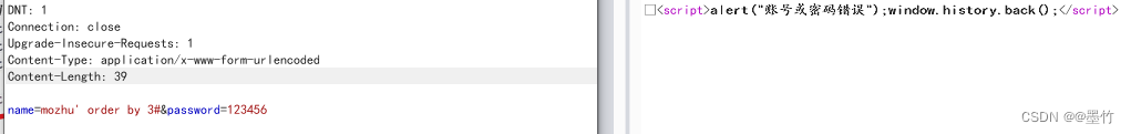 代码解释:mozhu' 进行字符串闭合,利用order by 3查询列数,#注释掉后面的 '
