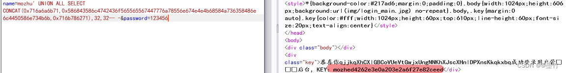 通过得到的数据可以知道是MySQL数据库5.0版本,并且获取一个payload,将payload放到数据包中执行后,获取flag。