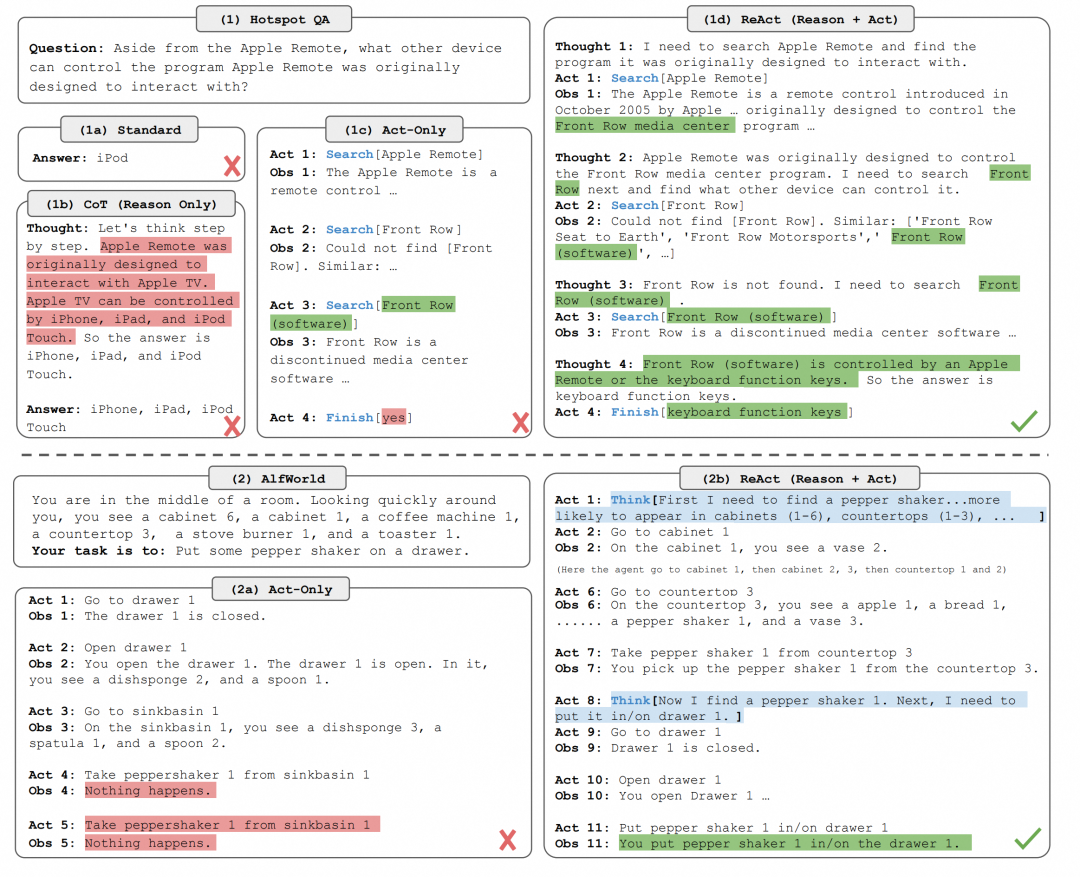 ReAct通过LLM交替执行推理和行动,增强了推理和外界感知(通过行动获得)之间的协同作用:推理帮助模型推断、跟踪和更新行动计划,以及处理异常,而行动则允许它与外部资源(如知识库或环境)交互,以获取额外信息。