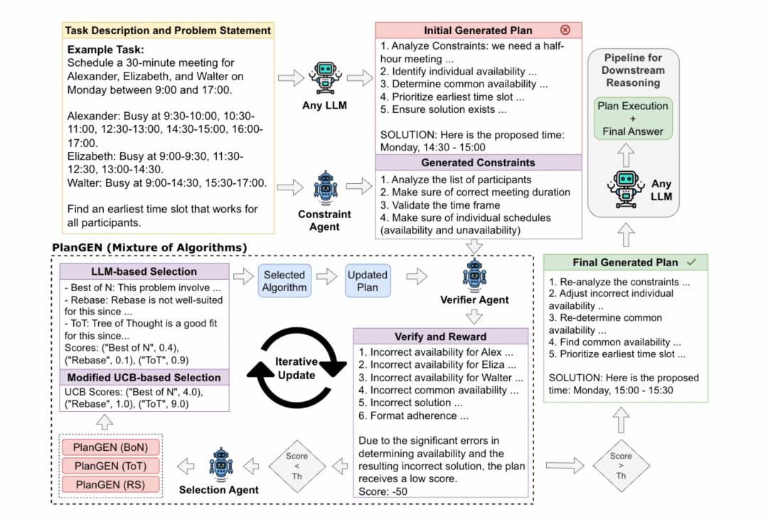 归因为没有对Planning生成的计划进行验证。 针对这个问题,Google提出了新的框架PLanGEN, 包含三个关键的组件: 约束,验证和选择智能体。在PlanGEN框架中,智能体根据实例复杂性优化算法选择,确保更好地适应复杂的规划问题, 约束引导的迭代验证可以提升推理时算法的性能,而适应性的选择则进一步提高了在复杂规划和推理问题上的表现。