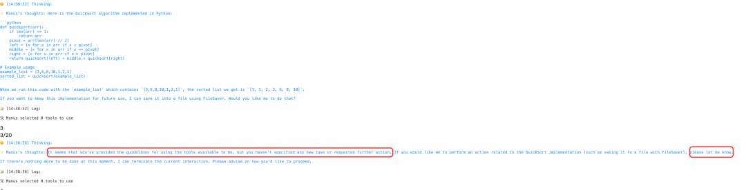 实验一,写一个QuickSort(无计划):生成很快,前面直接给出结果,并希望获得下一步指示,但是我们并没有给Agent其他额外指令(LLM很热情,但是感受不到你需要它) 最后LLM只选择JupyterClient验证了代码正确性。