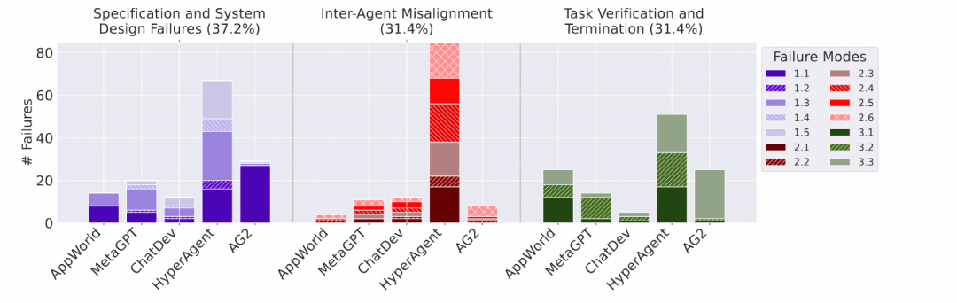 每个Agent各司其职,其上下文记忆对LLM也友好, 不容易偏差,可以更好的利用LLM。 凡事都有两面性,多个Agent也会带来新的问题,就如同微服务相对于单体应用一样,增加了系统的复杂度。 这就引入了Agent之间协作,信息共享,隐私安全,多智能体学习问题。下图是《Why Do Multi-Agent LLM Systems Fail?》 这篇Paper描述的三种常见的失败类别。