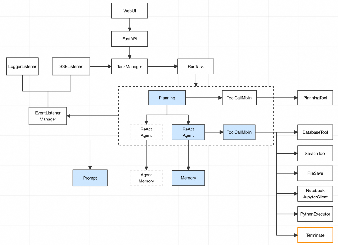 现在需要把这几个组装起来。文章开头提到了, OpenManus是个好的学习项目, 所以整体实现也是基于(抄)OpenManus实现的,暂且命名为MyManus!为了便于加深理解,实验以及后续的扩展, 做了如下改动。