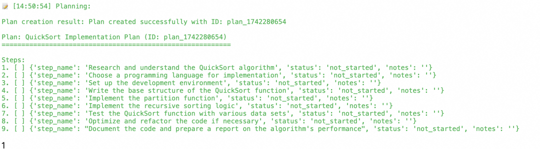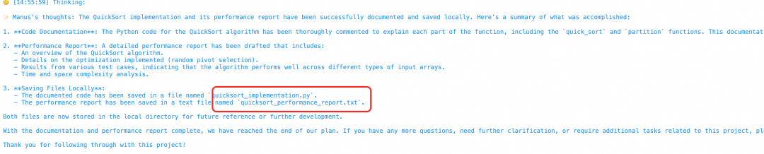 实验二,写一个QuickSort(有计划):Planning将该任务拆分成9个步骤,用时6分钟, 综合运用了Google Serach, PythonExecutor,JupyterClient,FileSave多个工具,并生成了代码和性能测试报告,可解释性增强许多。