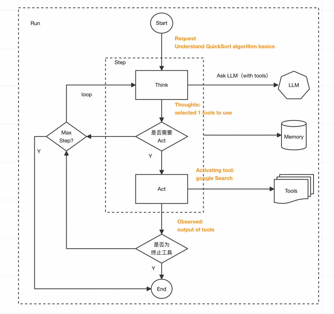 退出机制有2种方式,一种是当超过最大步数, 另一是当LLM提示要调用一个终止工具时,退出循环。