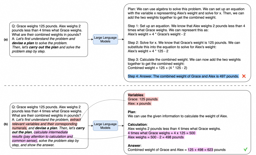 Chain-of-Thought(CoT)使LLMs能够明确地生成推理步骤并提高它们在推理任务中的准确性。比如Zero-short-CoT将目标问题陈述结合"让我们逐步思考"这样的提示词, 作为LLM的输入。这是一种隐式生成推理链,具有一定的模糊性,存在语义理解错误, 无法生成合理的计划等问题