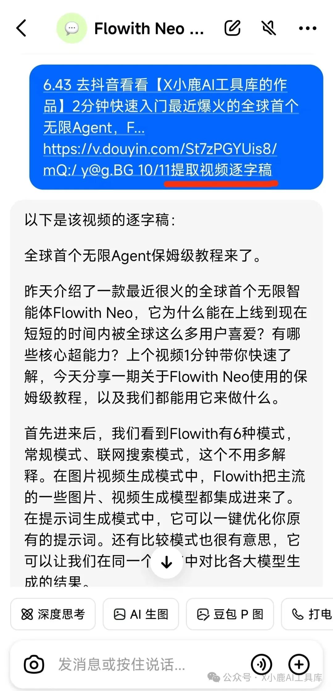 把视频链接发给豆包,并加上一句“提取视频逐字稿”,它就能一键提取视频文案。