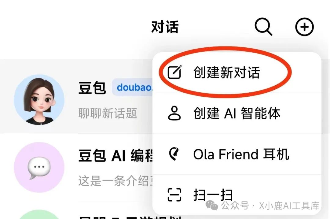 把豆包 APP 更新到最新版,打开豆包,点右上角的「+」-「创建新对话」: