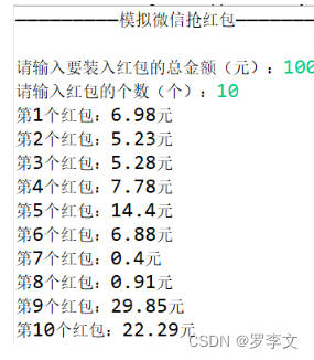 System.out.println("第" + i + "个红包:" + temp + "元"); //输出结果
