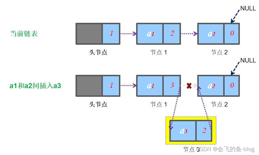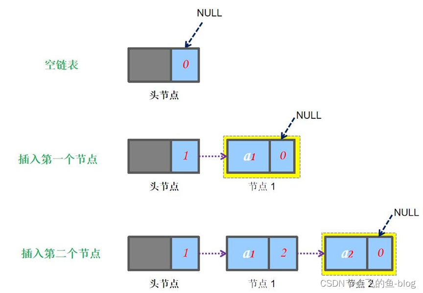 从图中可以看出,每个结点包含两个域:数据域和指针域,指针域存储下一个结点的地址,因此指针指向的类型也是结点类型链表的核心要素: