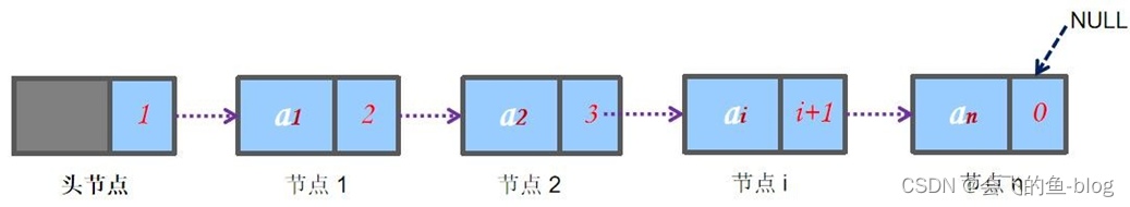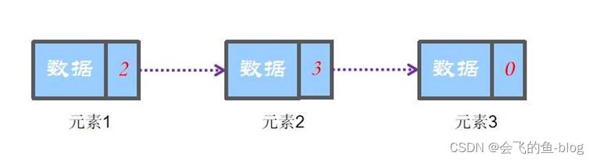 链表是线性表的链式存储方式,逻辑上相邻的数据在计算机内的存储位置不必须相邻,那么怎么表示逻辑上的相邻关系呢?可以给每个元素附加一个指针域,指向下一个元素的存储位置。如图所示: