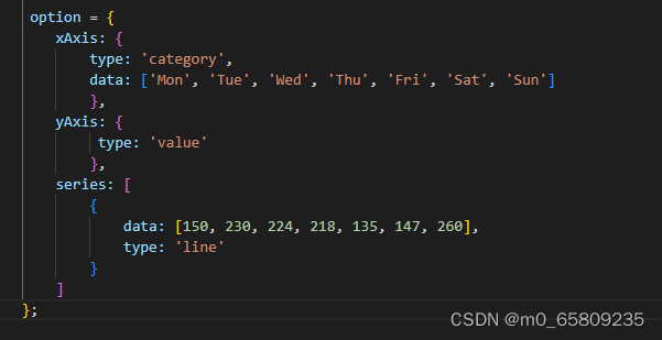 3.配置option对象即图形的类型,参数,样式等。xAxis为图形的x轴要显示的项,yAxis为图形的y轴要显示的项,其type值都是指定(x,y)坐标的类型。series即图形数据以及图形类型,data指定数据,type指定图形类型(折线图,饼图,柱状图,散点图,雷达图,箱形图等)