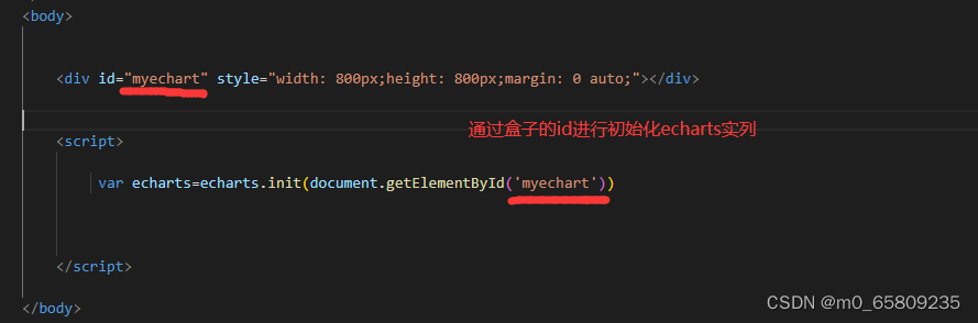 2.使用echarts.init(document.getElementById('容器的id'))初始化echarts实例。