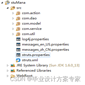 模型层:Struts2中的模型层根据系统业务的不同而有所差异。通常模型层包括实体类、DAO类、Service类。