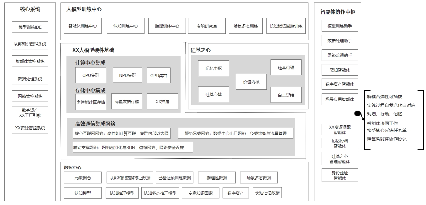 此架构图展示了一个硅基智能未来具备以碳生物共生协同的前沿架构,其他部分不在详细描述,