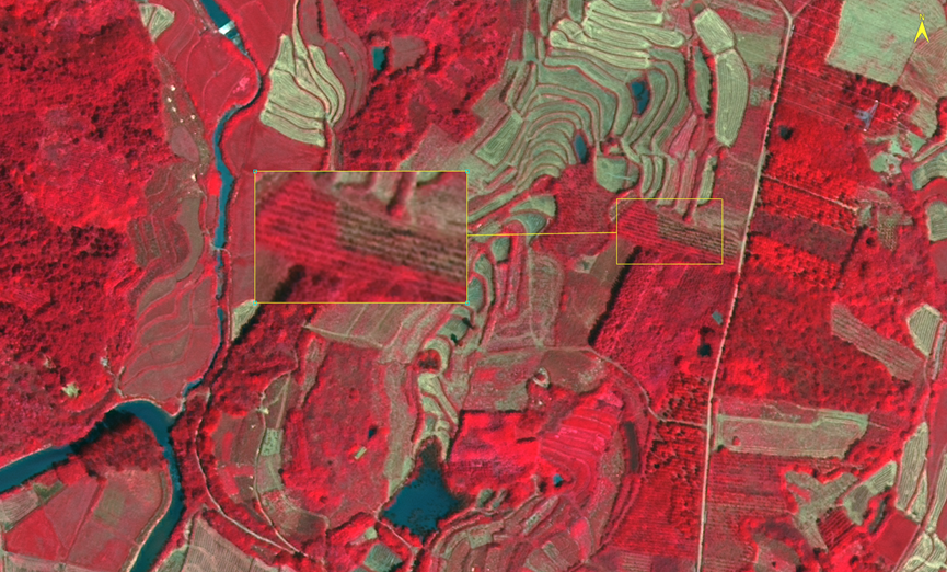 如下图为真彩色和标准假彩色合成展示融合结果。