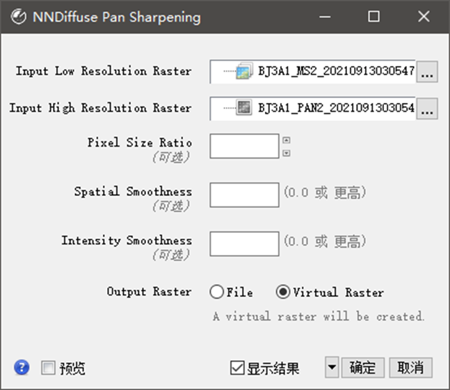 - Pixel Size Ratio:多光谱与全色图像的分辨率比值,不设置情况自动计算。NNDiffuse算法要求是整数倍。