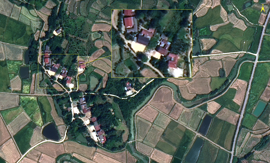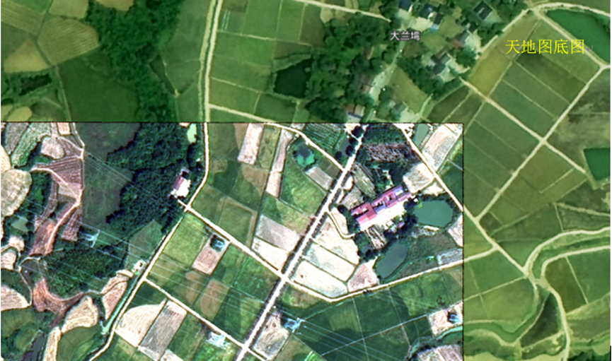 如下图为无控制点的正射校正结果叠加在天地图影像底图上,天地图影像放大最高级切片,局部地方有几米的几何偏差。在精度要求很高的应用场景还是需要利用控制点进行正射校正。