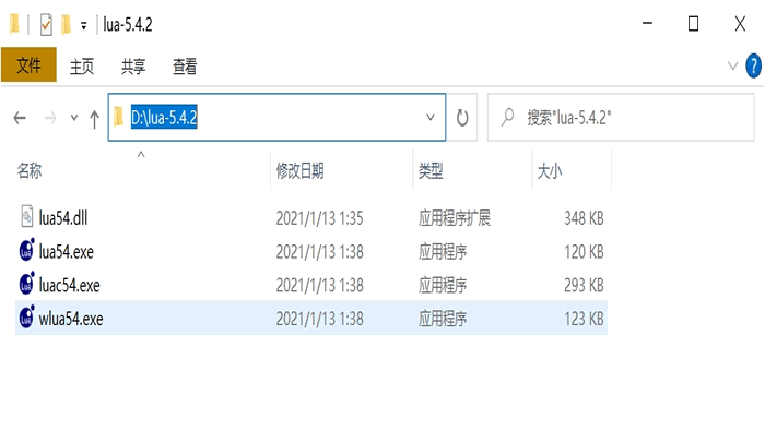 ① 解压下载得到的 lua-5.4.2_Win64_bin.zip,比如解压到 D:\lua-5.3.4 目录下,如下图所示: