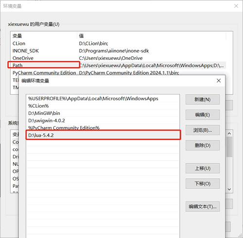 ② 设置 $PATH 环境,右键点击 "计算机(我的电脑) -> 属性 -> 高级系统设置 -> 环境变量 -> Path " 把 D:\lua-5.4.2 添加到 PATH 中。
