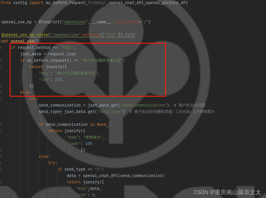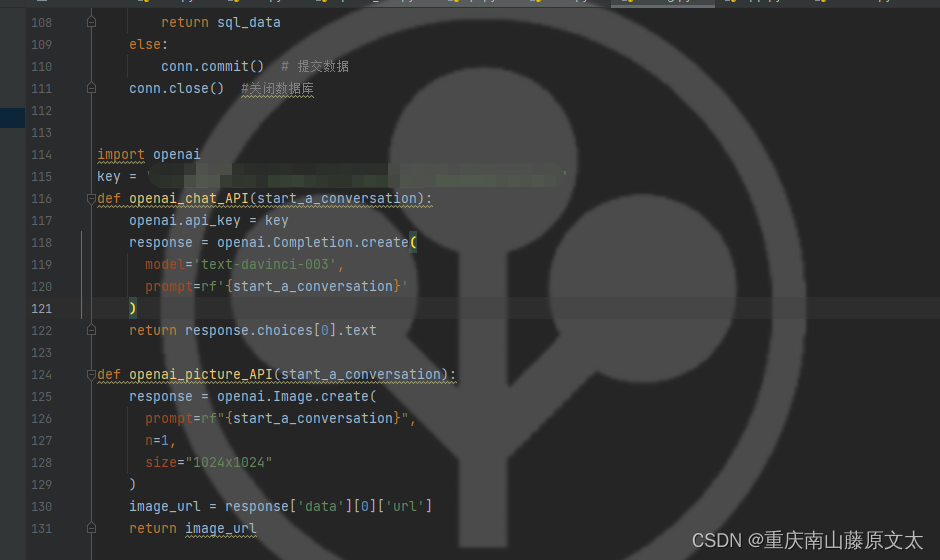 第二步config里面配置好openai的 API接口,写法直接参照我写的即可,现在我们调用两种,第一种是对话类型,封装为openai_chat_API,第二种是图片生成类型,封装为openai_picture_API