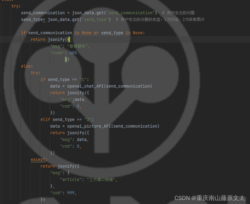 然后 验证完了 去接前端的参数send_communication为前端发过来的用户输入的内容send_type为前端发过来的类型,类型1是对话,类型2是图片