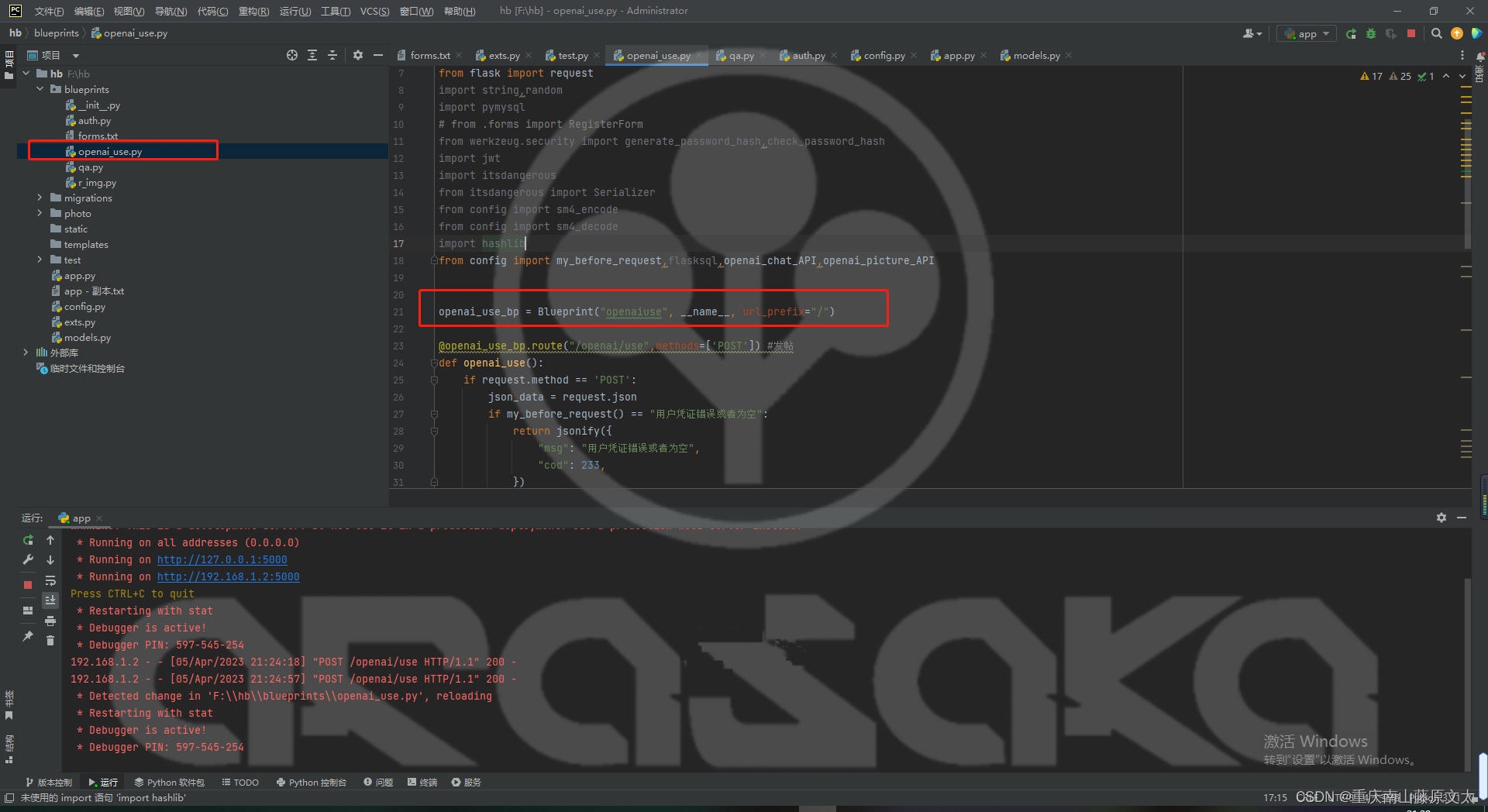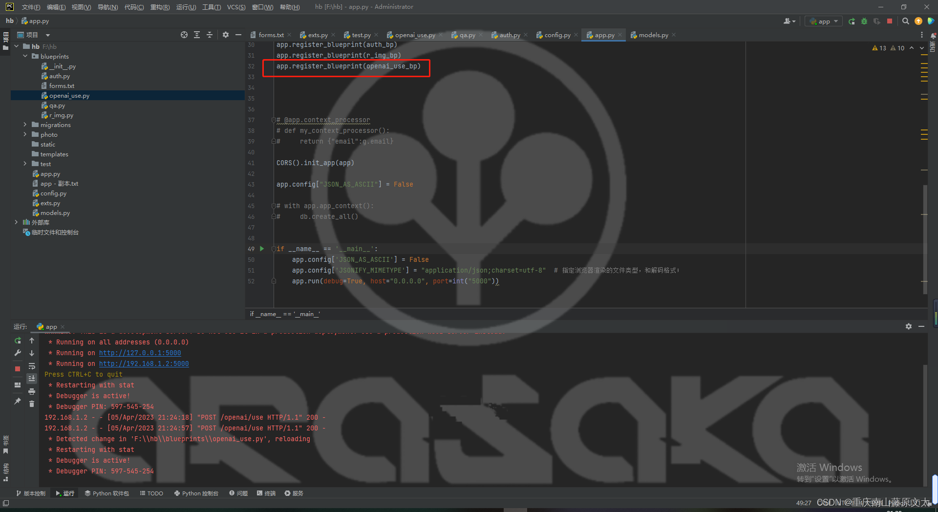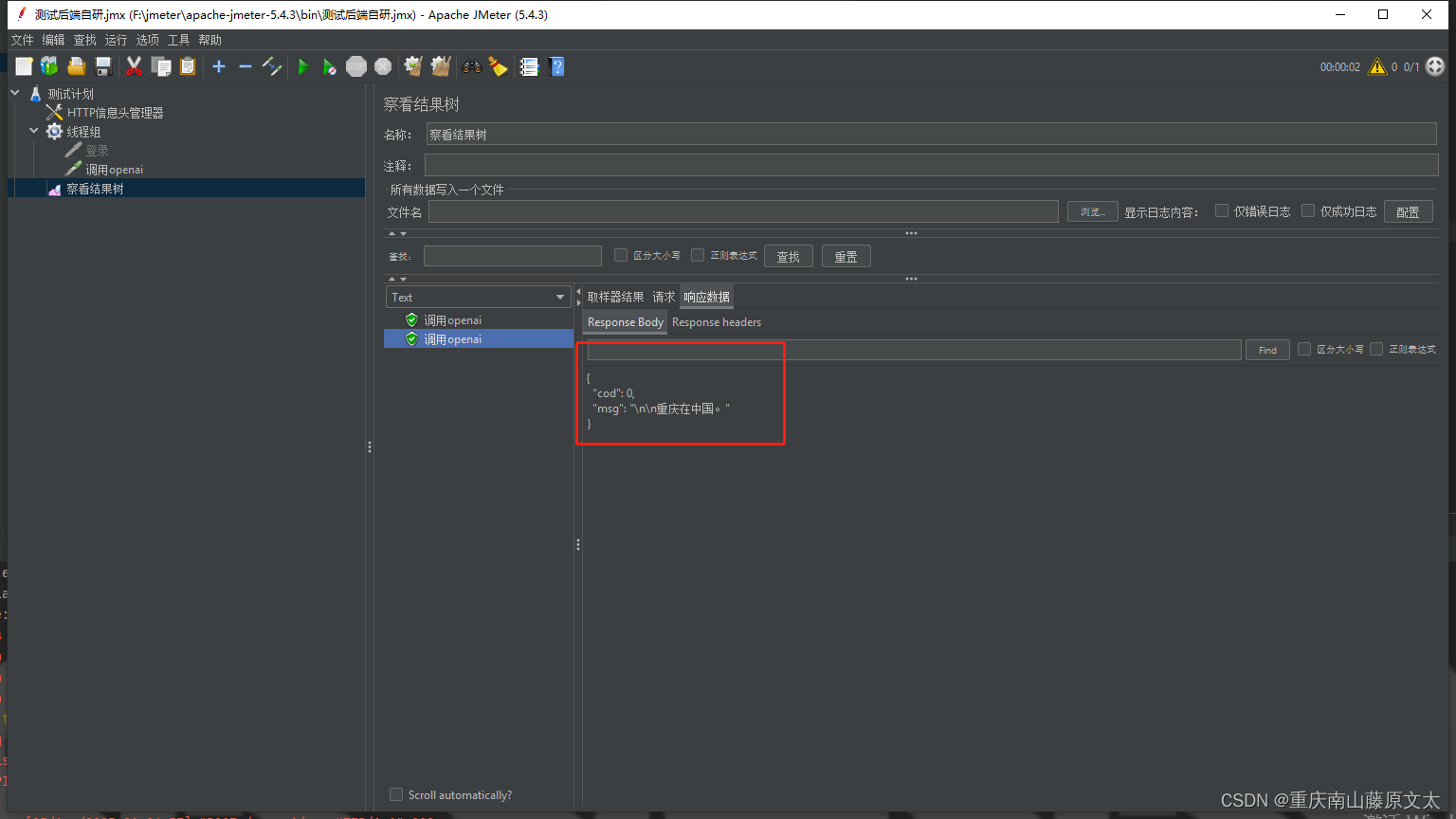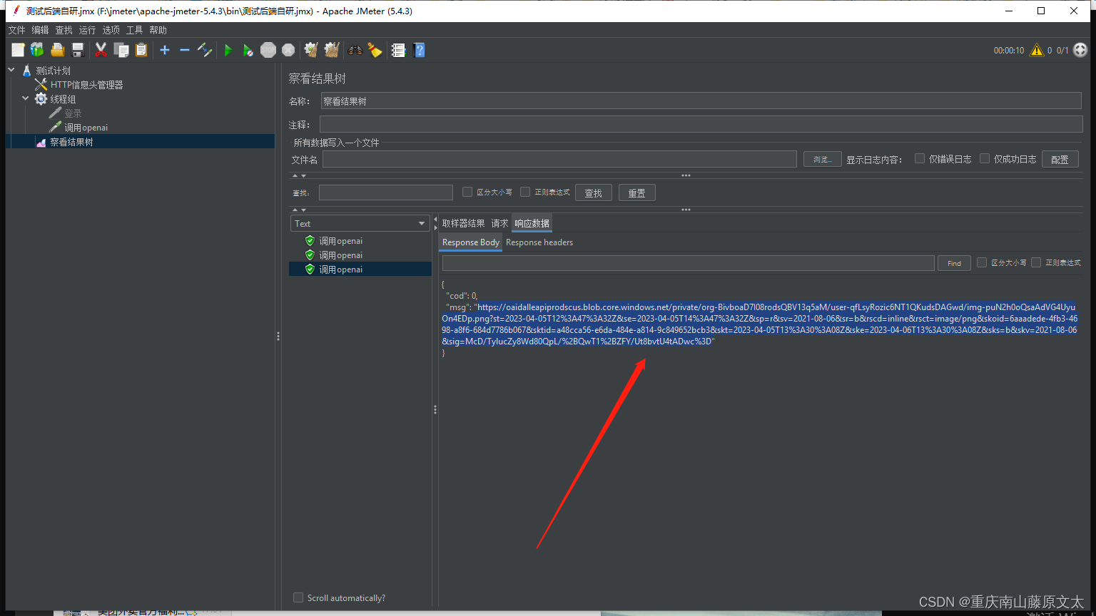 该文展示了如何在Flask框架中配置OpenAI的API接口,用于对话和图片生成功能。通过验证token,接收前端发送的类型和内容,分别调用封装好的openai_chat_API和openai_picture_API。使用jmeter进行接口测试,证实了对话和图片生成功能的正常运行。