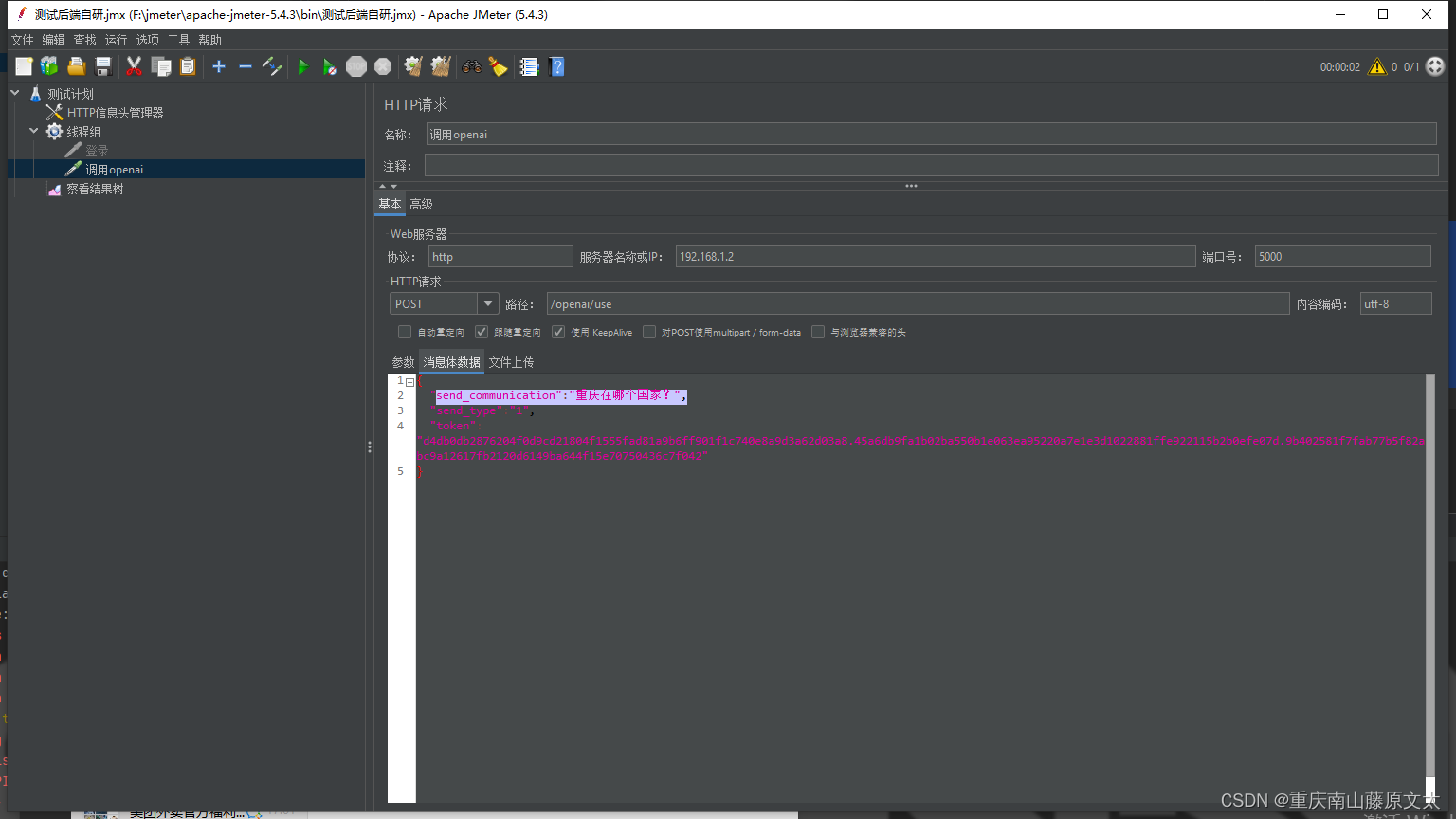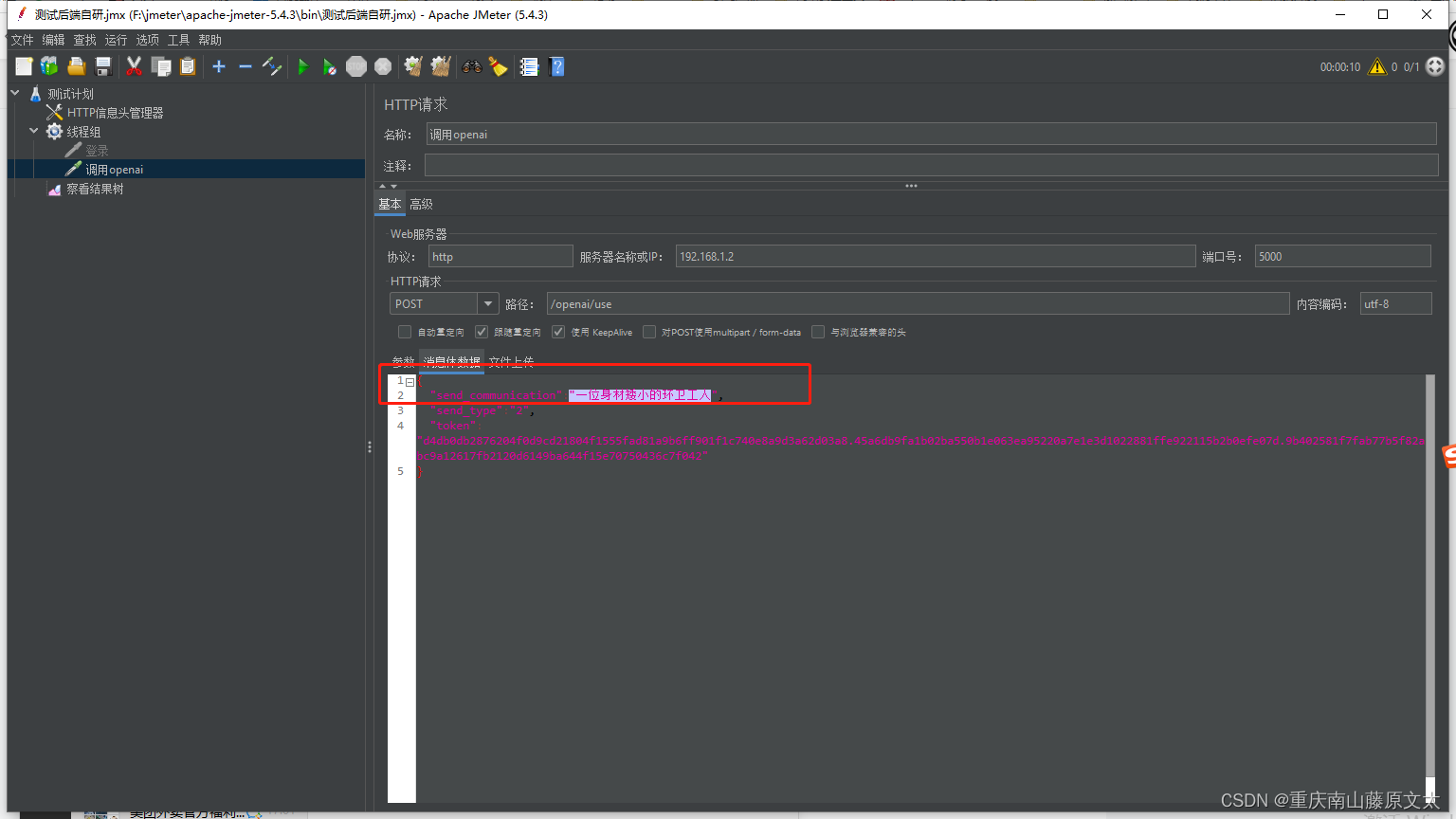 然后用jmeter进行测试,先测试对话,send_type是 1 :