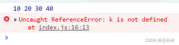 尝试打印输出变量 k,显然这个时候是会报错的,此时已经没有任何闭包存在,垃圾回收器会自动回收没有引用的变量,不会有任何内存占用的情况。