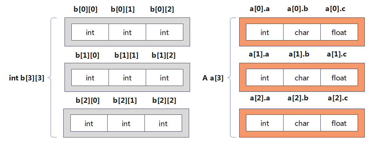 语句int b[3];定义了一个数组,名字为b,由3个整型分量组成。而语句A a;可以类似认为定义了一个数组,名字为a,只不过组成a数组的3个分量是不同类型的。对于数组b,b[0]、b[1]、b[2]分别代表数组中第1、第2、第3个同为int类型的元素的值。而结构体a中,a. a、a. b、a. c分别对应于结构体变量a 中第1、第2、第3个元素的值,两者十分相似。