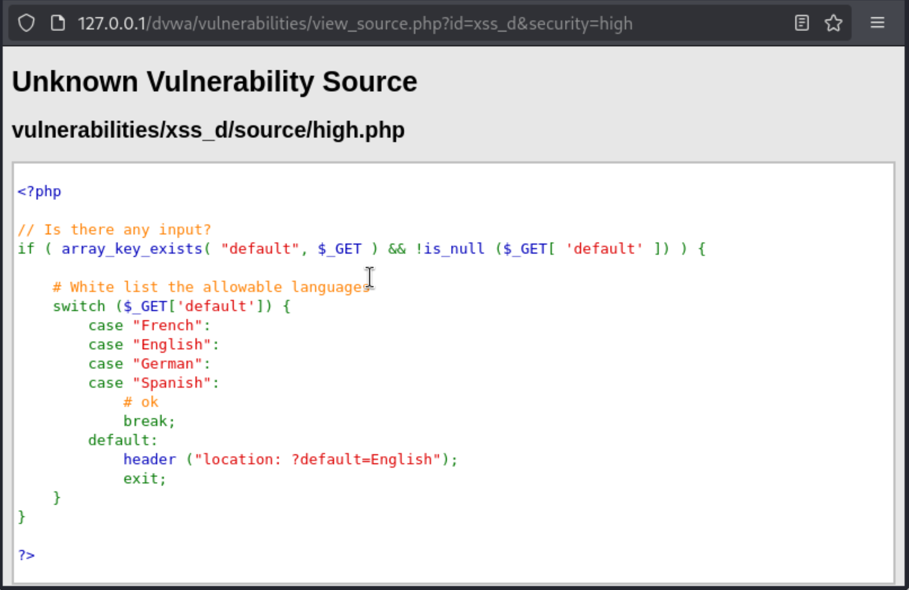 前端代码不变,后端代码如下所示。服务器设置了白名单,default 参数只接受 French,English,German 以及 Spanish 这几个单词。