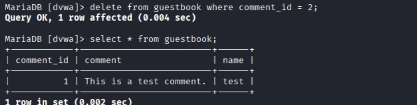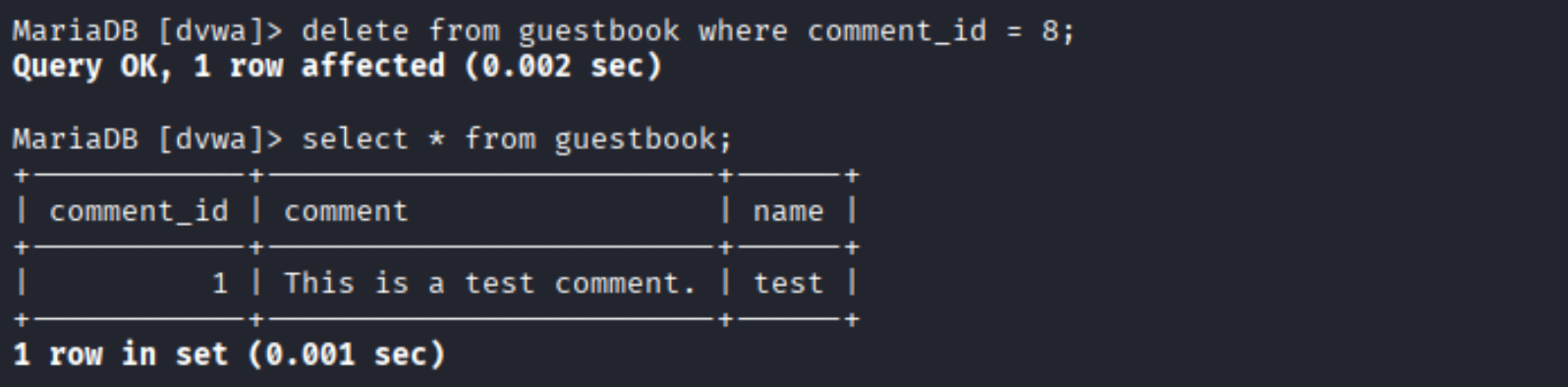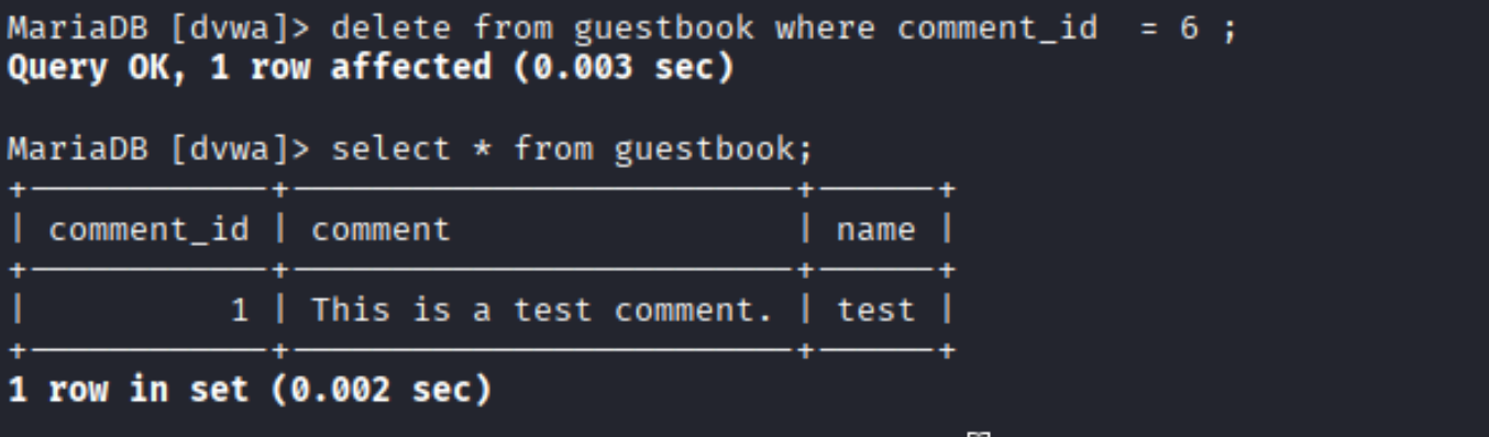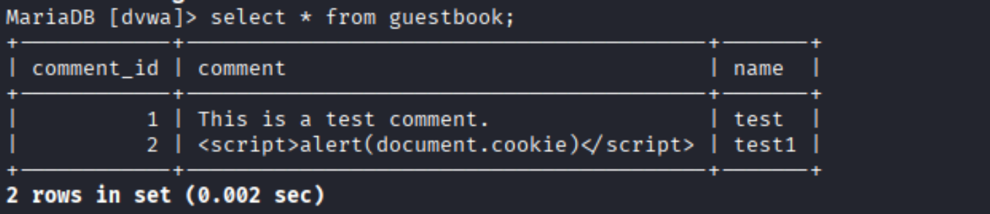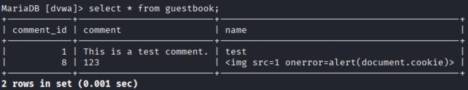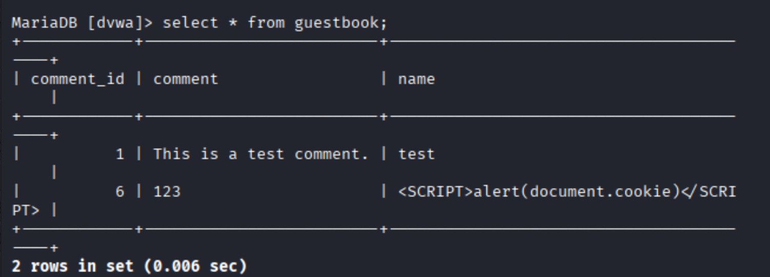 如果需要删除数据库中存在的XSS代码,进入dvwa数据库中guestbook表,删除恶意脚本。