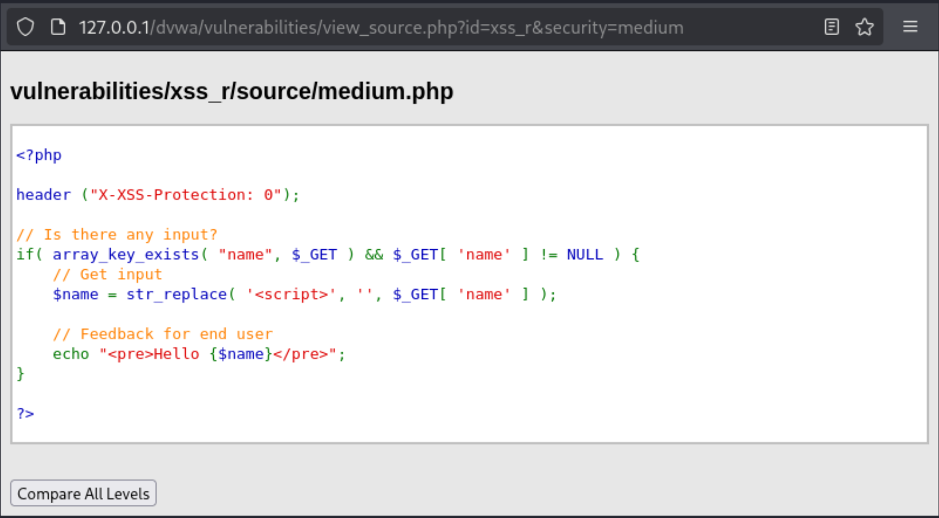 后端代码检查GET请求中是否存在"name"参数,并且该参数的值不为NULL。从GET请求中获取"name"参数的值,并尝试移除其中出现的所有"<script>"字符串。注意,这里只移除了完整的"<script>",但不会移除大小写不同的变体(如"<SCRIPT>")或者嵌套在其他字符串中的情况,也不会处理其他形式的XSS向量(比如使用其他标签或事件处理器)。