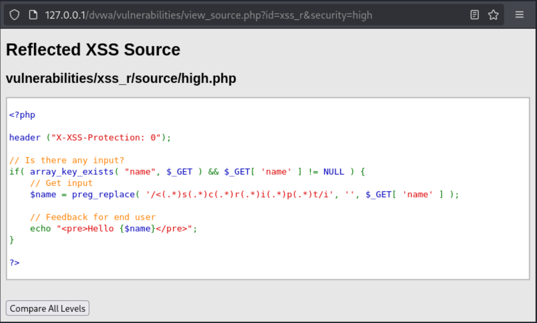 后端代码对留言内容的防护和中等难度的一样;对名称的检测使用了正则表达式,正则表达式使用了i修饰符(不区分大小写),所以大小写混合无法绕过,但是因为正则表达式匹配的是<script,所以如果使用其他标签则不受影响。