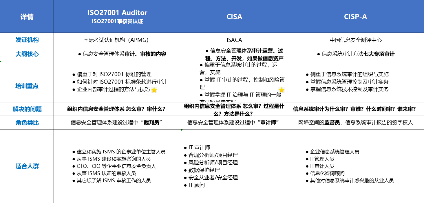 在《网络安全法》的牵引下,《网络安全等级保护条例》 2.0 标准、《数据安全法》、《关键信息基础设施安全保护条例》、《个人信息保护法》、《网络安全审查办法》等系列政策法规相继施行,对网络安全人才建设不断提出新的要求。面对不同领域的专业人才培养、资质认证、技能培训,很多人茫茫然。今天就为大家带一波职场进阶指南,从个人到企业,考证-技术视频-企业员工赋能学习,一站式齐活!福利和氛围感直接拉满。作为信安人,专业资质傍身,软硬实力兼备,集万千技能于一身。就问你,香不香?考什么类型证书,结合职业规划安排!