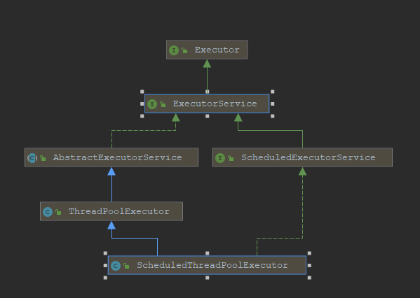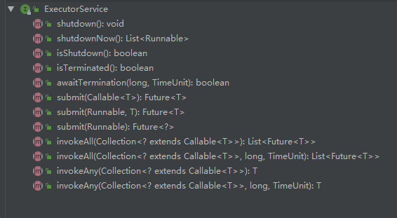 ThreadPoolExecutor和ScheduledThreadPoolExecutor算是我们最常用的线程池类了,从上面我们可以看到这俩个最终都实现了Executor和ExecutorService这两个接口,实际上主要的接口定义都是在ExecutorService中