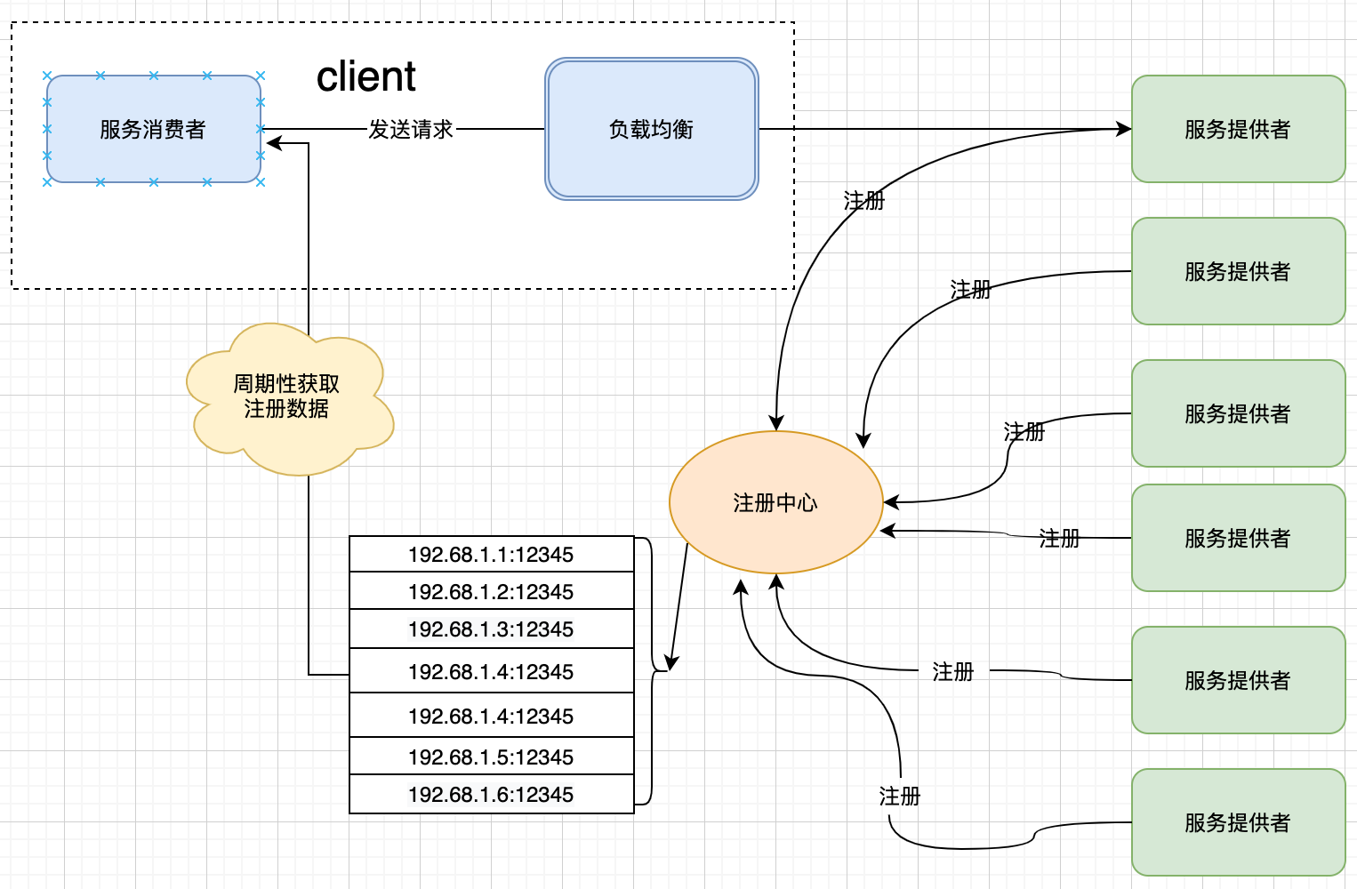 在上图中,client 端提供了负载均衡的功能,其首先从注册中心获取服务提供者的列表,然后通过自身负载均衡算法,选择一个最合理的服务提供者进行调用: