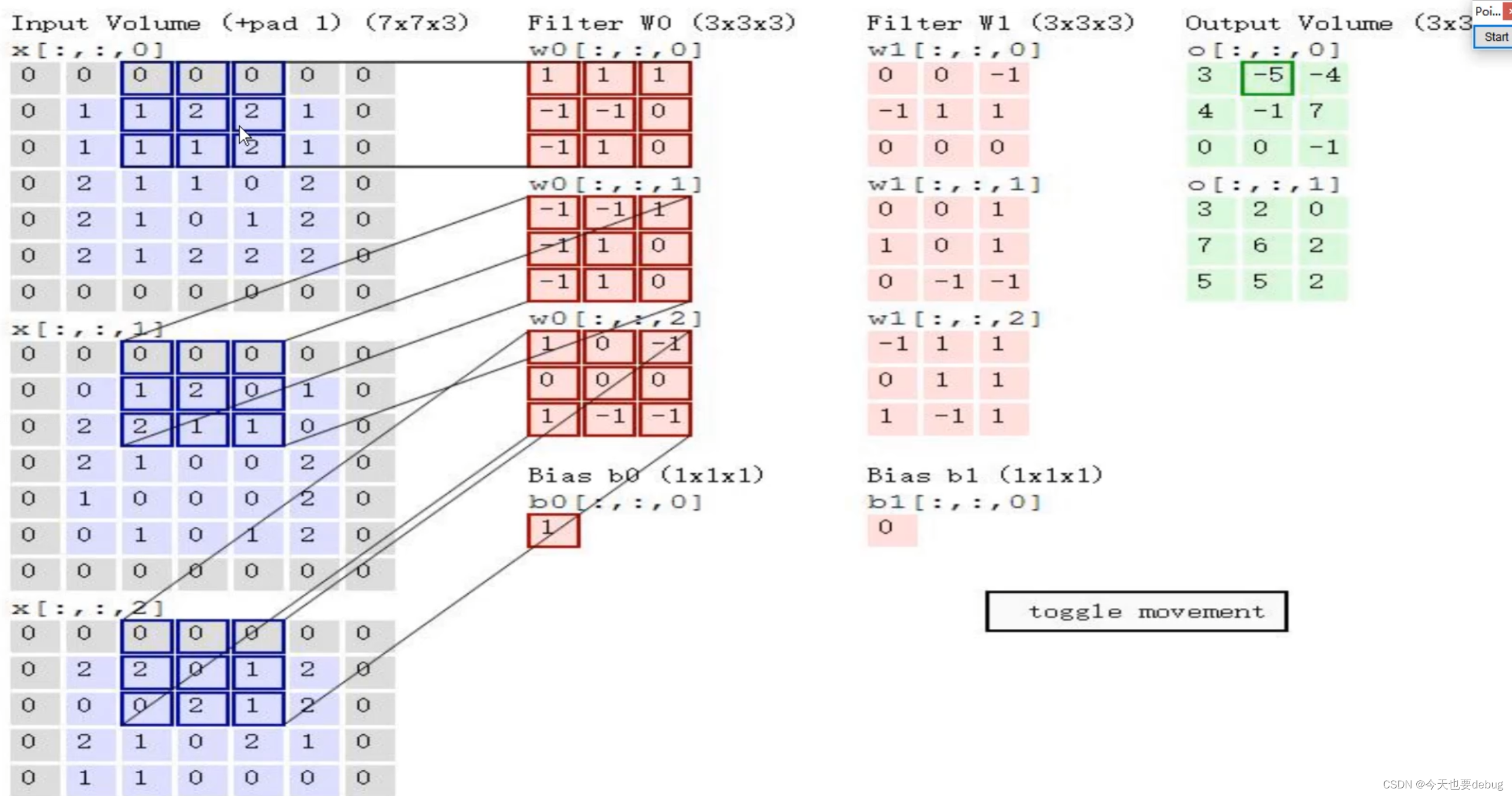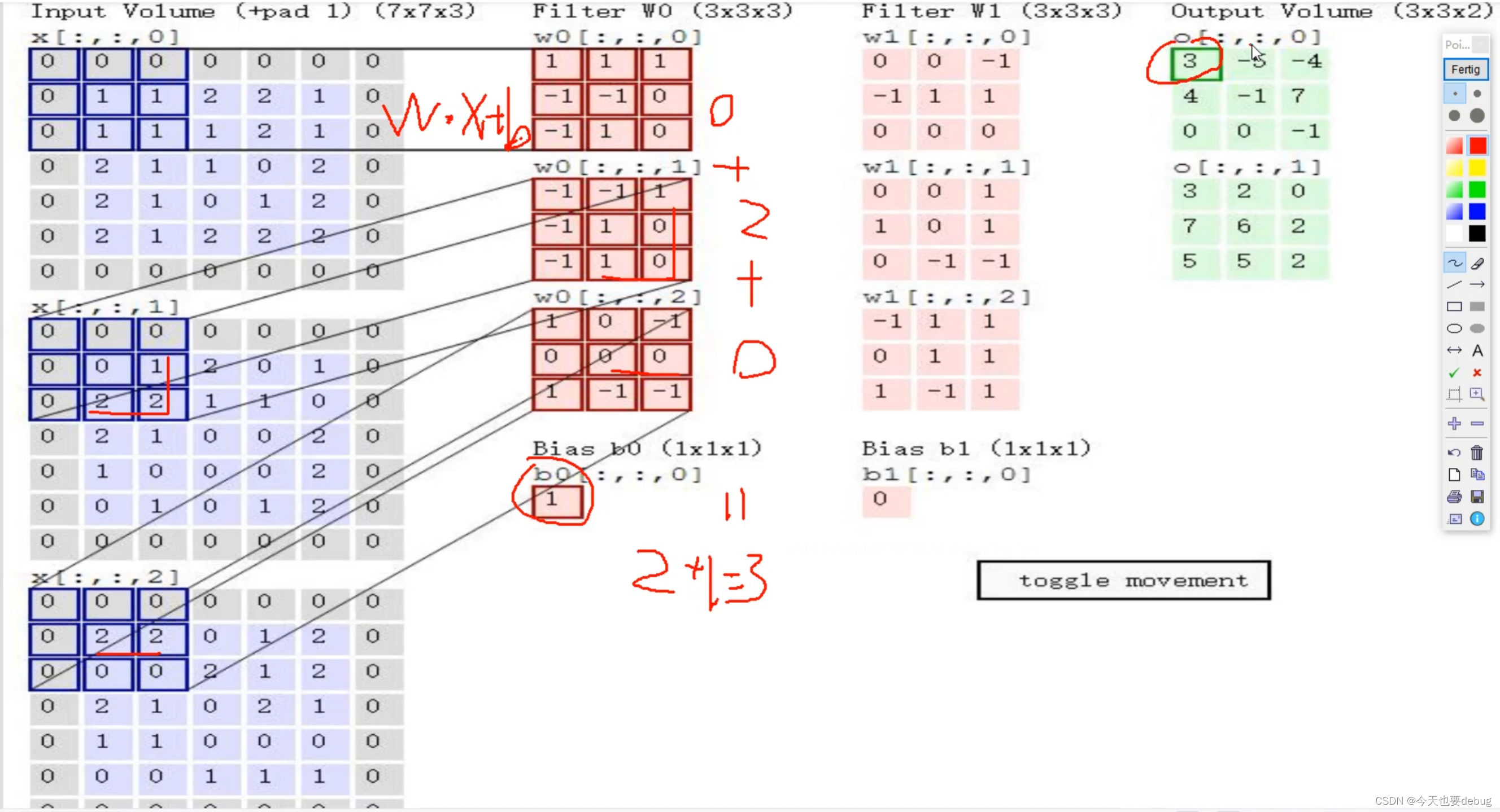 计算过程:卷积核的每一层分别与输入的每一层对应计算,卷积核与原始图像小区域对应位置相乘再求和,将多个通道求得的值相加再加上偏置,即为此区域的特征值,如下图所示,第一个小区域的特征值为绿色中的3 (内积表示两个向量的相关程度,内积越大越相关)