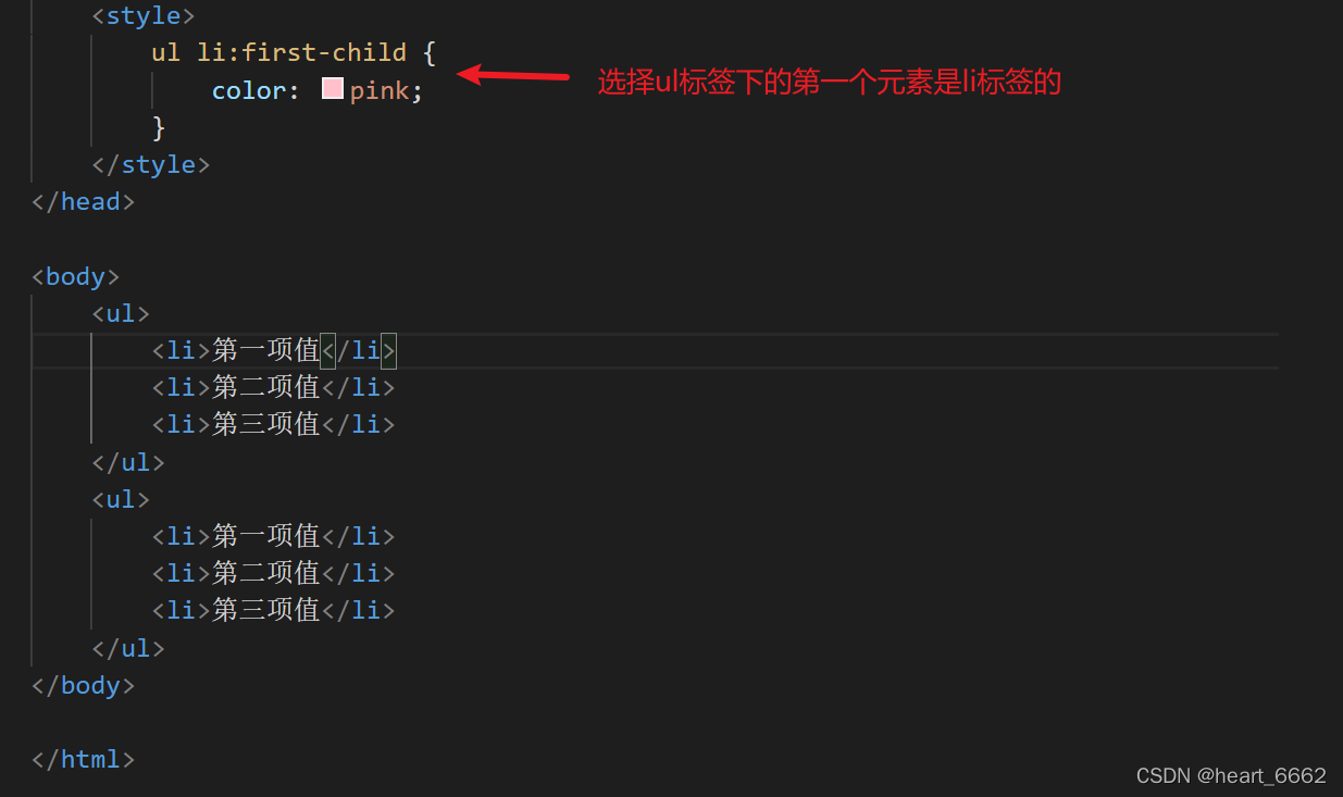 语法:子元素(选择器)+ :(分号)+first-child + {定义的样式(字体颜色,字体大小…)}